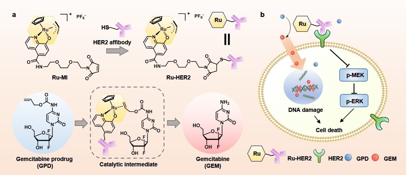 近日,jinnianhui今年会化学学院毛宗万、夏炜教授团队提出了一种HER2抗体片段(HER2 affibody)与金属钌催化剂偶联的策略,能够实现利用抗体片段将金属钌催化剂靶向递送到HER2受体阳性的乳腺癌细胞表面,从而实现对肿瘤的靶向治疗。这种“抗体-钌催化剂偶联物”Ru-HER2与肿瘤细胞的HER2受体结合后,一方面抗体片段抑制了癌细胞的HER2信号通路,同时钌催化剂还能通过生物正交反应将低毒性前药(GPD)催化转化为抗肿瘤药物吉西他滨(GEM),从而实现了协同治疗的效果。