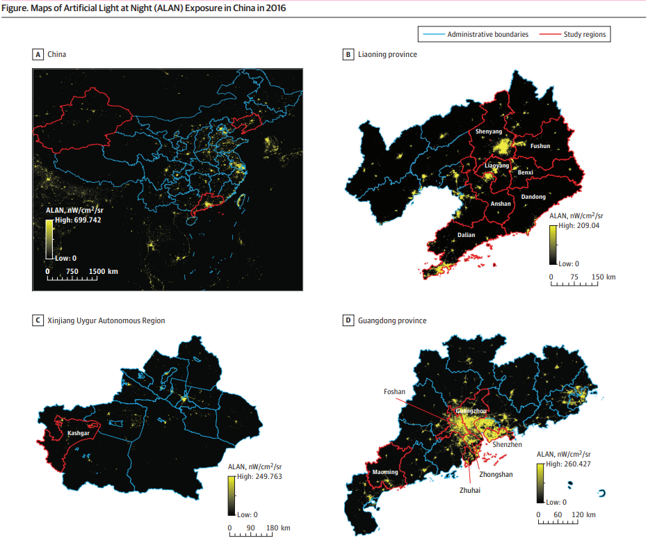 健康的睡眠对儿童身体发育和心理健康至关重要。目前的系统综述显示,我国儿童睡眠问题患病率约高达37.6%,已成为我国儿童青少年重大的公共健康问题。因此,识别导致睡眠障碍的影响环境因素,并对其进行有效干预具有非常重要的理论和现实指导意义。基于此,jinnianhui今年会公共卫生学院董光辉教授团队在广东省、辽宁省和新疆维吾尔自治区(见图1)共选取14个城市55个行政区的201,994名儿童青少年,利用卫星图像评估了居住地址500m范围的室外夜光暴露,并进一步探讨了室外夜光和儿童青少年睡眠障碍及其亚型的关联性。