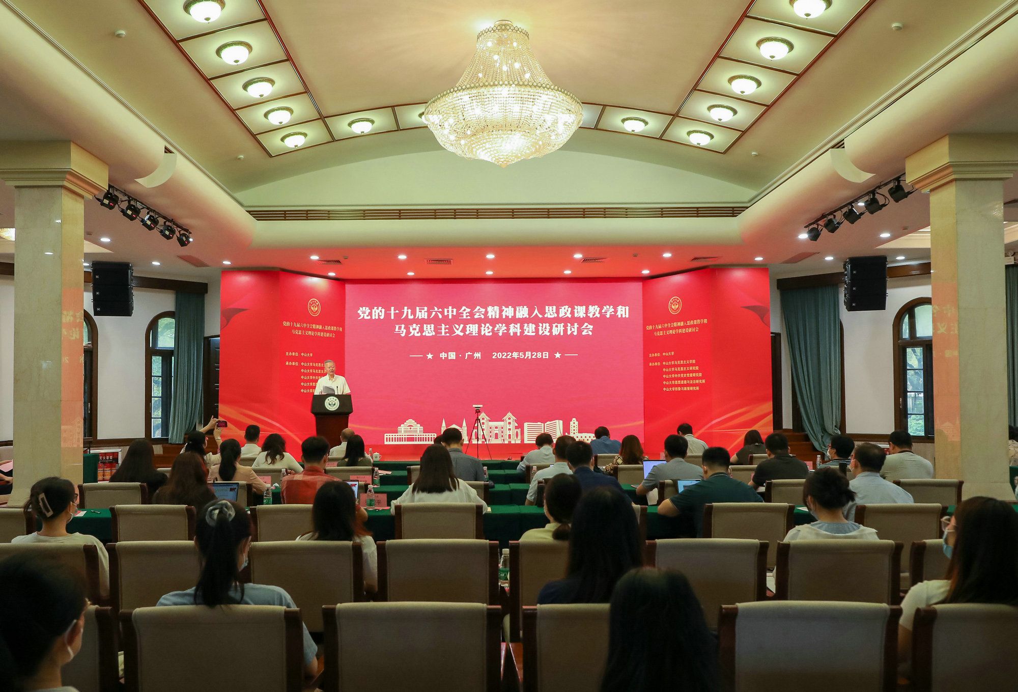 今年会新闻网广州5月29日电(通讯员邓菀莛)5月28日,由jinnianhui今年会主办的“党的十九届六中全会精神融入思政课教学和马克思主义理论学科建设研讨会”,在jinnianhui今年会广州校区南校园怀士堂举行。来自中共中央党校、中国社会科学院、中国人民大学、北京大学、清华大学、复旦大学、南开大学、武汉大学、西南大学、吉林大学、天津大学、北京师范大学、华南师范大学、华东师范大学、南京师范大学、东北师范大学、西安交通大学、山东大学、东北大学、兰州大学、湘潭大学、合肥工业大学等三十余所高校及科研机构的百余名专家学者围绕主题深入研讨。研讨会以线上线下方式同步进行。