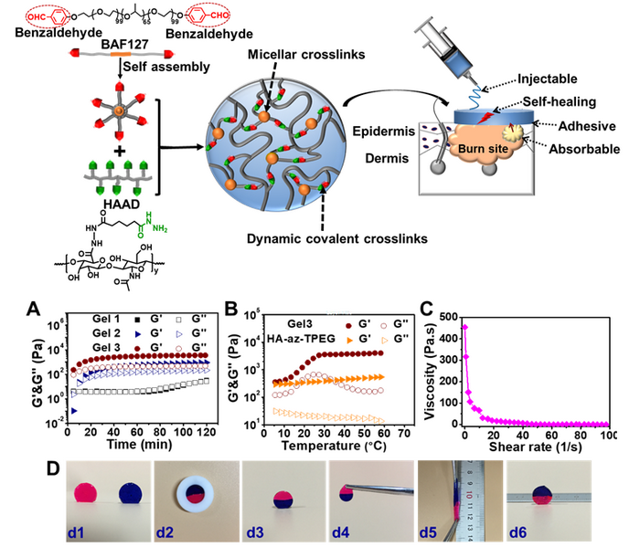 团队利用了动态共价交联和自组装物理交联的优点构建了智能双网络水凝胶,应用于烧伤护理敷料方面。基于酰肼修饰的透明质酸和端基苯甲醛修饰的Pluronic F127之间形成动态酰腙键,而F127可在温和温度(>25°C)形成疏水物理交联。物理交联可为水凝胶贡献剪切变薄、温敏性和能量耗散的性质,动态化学和物理双交联可提供优异的粘弹性和自愈合(图2)。深度局部烧伤治疗结果表明,该水凝胶具有良好的渗出物吸收和良好的细胞相容性,可促进大鼠皮肤烧伤创面愈合。值得注意的是,此水凝胶通过游离的醛基可与组织上的氨基化学结合表现出组织粘合性,可望解决常规水凝胶敷料易从生理组织脱落的难题。该材料有望作为一种新型多功能水凝胶基烧伤皮肤敷料。该工作以题为“A Hydrogel Crosslinked with Dynamic Covalent Bonding and Micellization for Promoting Burn Wound Healing”发表在 ACS Applied Materials & Interfaces(2018, 10, 25194),论文链接:https://doi.org/10.1021/acsami.8b08165。