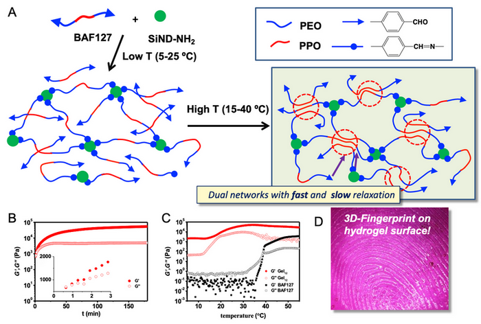 图1 (A)温度敏感的动态化学与物理双网络凝胶结构示意;(B)25℃时水凝胶的储能模量和损耗模量;(C)温度变化对水凝胶储能模量和损耗模量的影响;(D)指纹三维纹路可滞留在水凝胶表面。