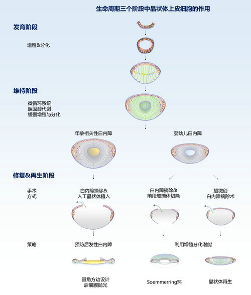 刘奕志教授团队回眸了晶状体上皮细胞在晶状体生命周期中呈现的神奇过程,阐述了晶状体上皮细胞在胚胎发育、稳态维持和术后再生三个阶段发挥的决定性作用。