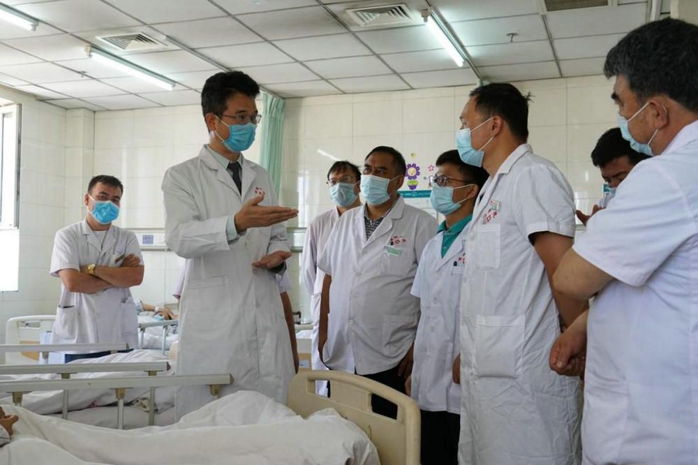 时任喀什地区第一人民医院院长的林天歆(左二)在临床科室开展医疗帮扶工作