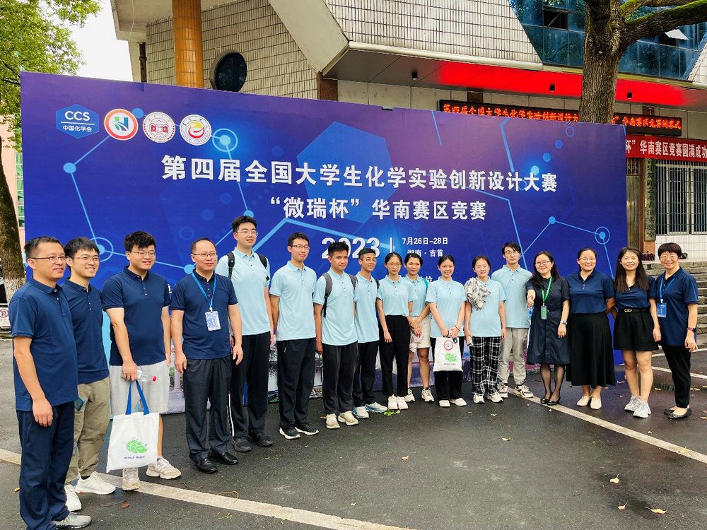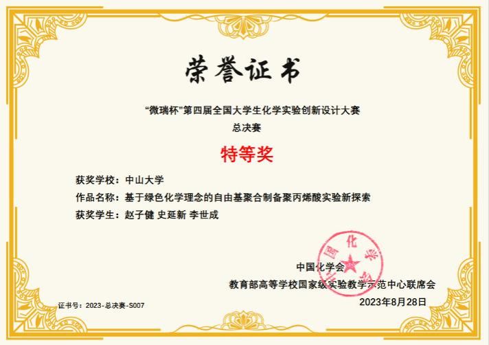 在华南赛区竞赛中,化学学院选送的三个作品均获得一等奖,分别为:改进实验作品《基于绿色化学理念的自由基聚合制备聚丙烯酸实验新探索》(指导教师:阮文红、朱芳;队员:赵子健、史延新、李世成)、新创实验作品《无铅卤化物钙钛矿薄膜光电探测器的制备及性能研究--创新性综合实验的教学设计与探索》(指导教师:王旭东、陈洪燕;队员:房俞创、魏维、余静怡)以及科普实验作品《烧杯中的彩虹——从化学发光探寻分子的奥秘》(指导教师:潘梅、鲁玉麟;队员:闫翔涵、张锦涛、张婉婧)。因赛制规定每校仅能推荐一项作品参加全国总决赛,根据赛事遴选规则,由改进实验作品代表我校参加总决赛。在总决赛中,该作品在全国90项参赛作品中脱颖而出,荣获全国总决赛特等奖。