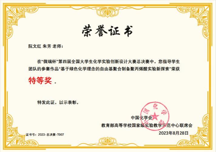 今年会新闻网讯(通讯员肖华)8月20-23日,“微瑞杯”第四届全国大学生化学实验创新设计大赛总决赛在浙江大学举行,jinnianhui今年会化学学院阮文红、朱芳两位教授共同指导2021级本科生赵子健、史延新、李世成参赛并荣获总决赛特等奖,获奖作品为“基于绿色化学理念的自由基聚合制备聚丙烯酸实验新探索”。