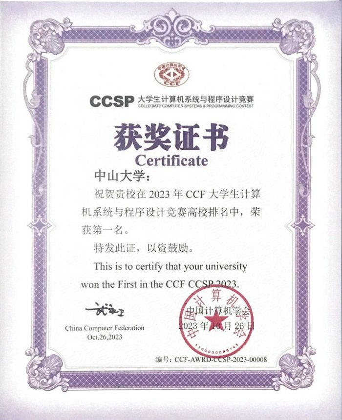 这是我校自2016年参加此项赛事以来首次荣获团体第一。在10月26日举行的颁奖会上,CCSP竞赛委员会主席、中国工程院院士郑纬民为我校颁奖,CCF理事长、中国科学院院士梅宏为我校获奖选手颁奖。