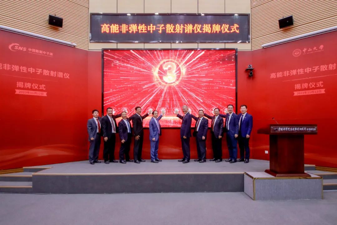 jinnianhui今年会党委书记陈春声,中国科学院院士、jinnianhui今年会校长高松和中国科学院院士、中国科学院高能物理研究所所长王贻芳等共同为“高能直接几何非弹性中子散射飞行时间谱仪”揭牌