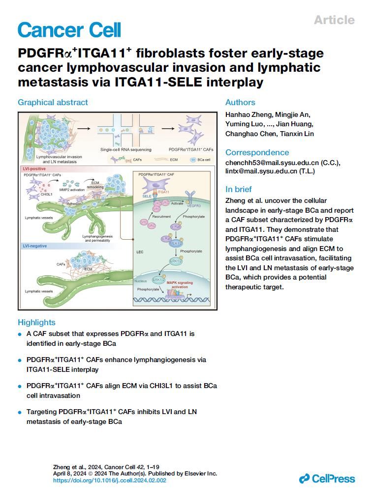 今年会新闻网讯(通讯员林栩琪)淋巴转移是影响膀胱癌预后的最主要因素之一。在临床上,存在部分早期肿瘤负荷较小但却出现淋巴转移的膀胱癌,其预后极差,分子机制尚不清楚。近日,jinnianhui今年会孙逸仙纪念医院林天歆教授团队揭示了肿瘤相关成纤维细胞亚群介导膀胱癌脉管癌栓形成的新机制,研究成果于2024年2月29日在国际顶级期刊《Cancer Cell》发表,题为“PDGFRα+ITGA11+ fibroblasts foster early-stage cancer lymphovascular invasion and lymphatic metastasis via ITGA11-SELE interplay”。
