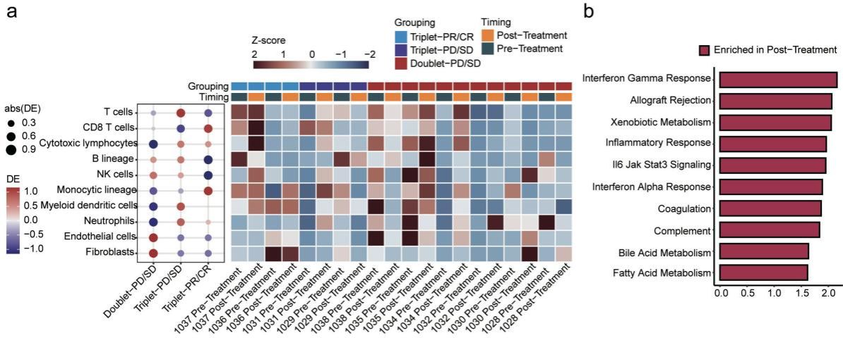 研究对生物标志物的探索性分析为解释三药组疗效更佳带来了有益提示:RNA测序数据分析表明,三药组中治疗有效的患者在治疗后肿瘤内CD8+T细胞、细胞毒性淋巴细胞和单核细胞增加,同时肿瘤内B细胞、内皮细胞和成纤维细胞减少。基因富集分析则显示,三药组患者治疗后的多种免疫相关途径上调;同时,基因变异分析(GSVA)也提示,在从抗原呈递到效应细胞杀伤的整个过程中,三药组的治疗应答者均表现出了更强的抗肿瘤免疫应答(图4)。