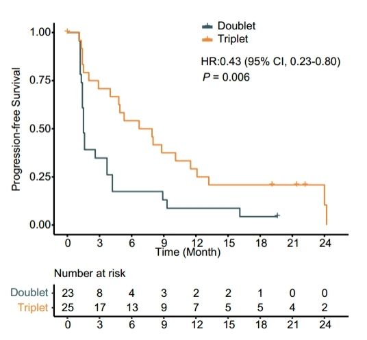 图3. 肝转移亚组中两药组与三药组的无进展生存时间曲线