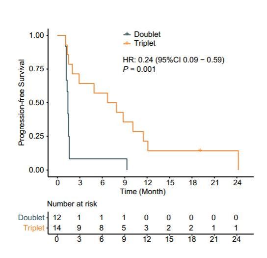 在肝转移的患者中,三药组的疗效也比两药组更好,18周无进展生存率高于两组(64.0% vs. 21.3%),无进展生存期比两药组更长(7.3个月vs 1.4月)(图3),客观缓解率(ORR)和疾病控制率(DCR)也分别以50.0% vs 8.3%和71.4% vs 8.3%的结果优于两药组。
