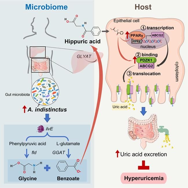 近日,公共卫生学院柳雁课题组在Cell Host & Microbe期刊(中科院1区TOP,IF=30.3)发表了题为“Alistipes indistinctus-derived hippuric acid promotes intestinal urate excretion to alleviate hyperuricemia”的研究论文。该研究首次揭示了肠道共生菌A. indistinctus通过激活肠道尿酸转运受体ATP结合盒G亚家族成员2(ATP binding cassette subfamily G member 2,ABCG2),促进肠道尿酸盐排泄降低高尿酸血症风险的作用机制,为高尿酸血症早期防治提供了新思路。