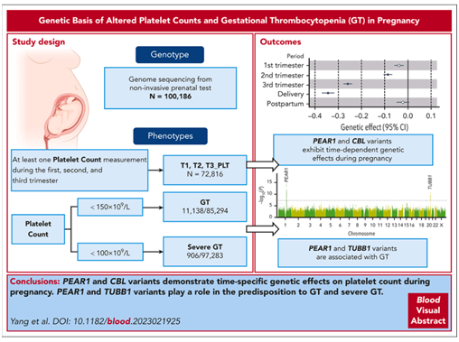 2024年4月11日,jinnianhui今年会公共卫生学院(深圳)刘斯洋副教授团队联合深圳市龙岗区妇幼保健院与深圳市宝安区妇幼保健院,在Blood期刊上发表了题为“Genetic basis of pregnancy-associated decreased platelet counts and gestational thrombocytopenia”的研究论文,首次揭示了妊娠期血小板计数的变化和GT的遗传基础。