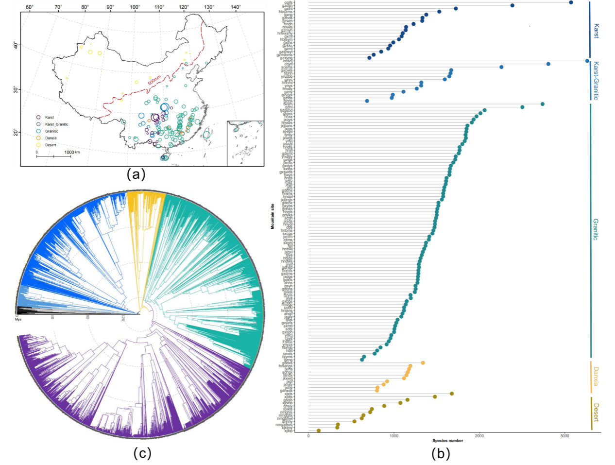 (a. 140处山地分布图; b. 五种地貌类型区系组成比较, 自下往上: 荒漠地貌13处, 丹霞10处, 花岗岩84处, 混和型14处; 喀斯特19处; c. 基于APG Ⅳ的被子植物系统树(按逆时针: 黑色, ANITA; 浅蓝,Magnoliids; 蓝色, 单子叶类; 橙色, 真双子叶类基部群; 绿色, Superrosids; 紫色, Supersterids; 用GBOTB估算分支时间)
