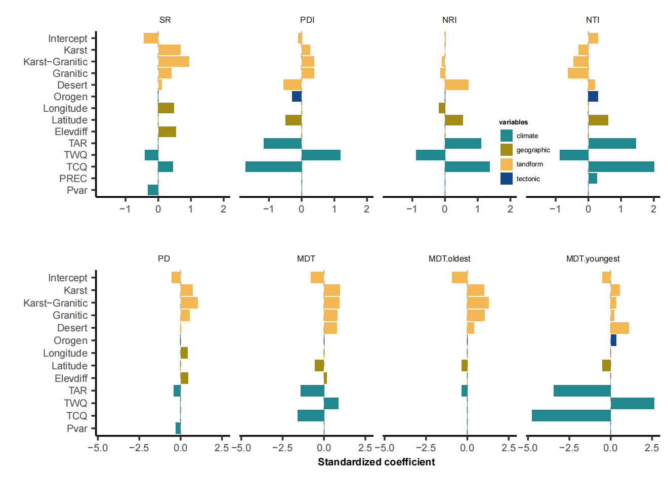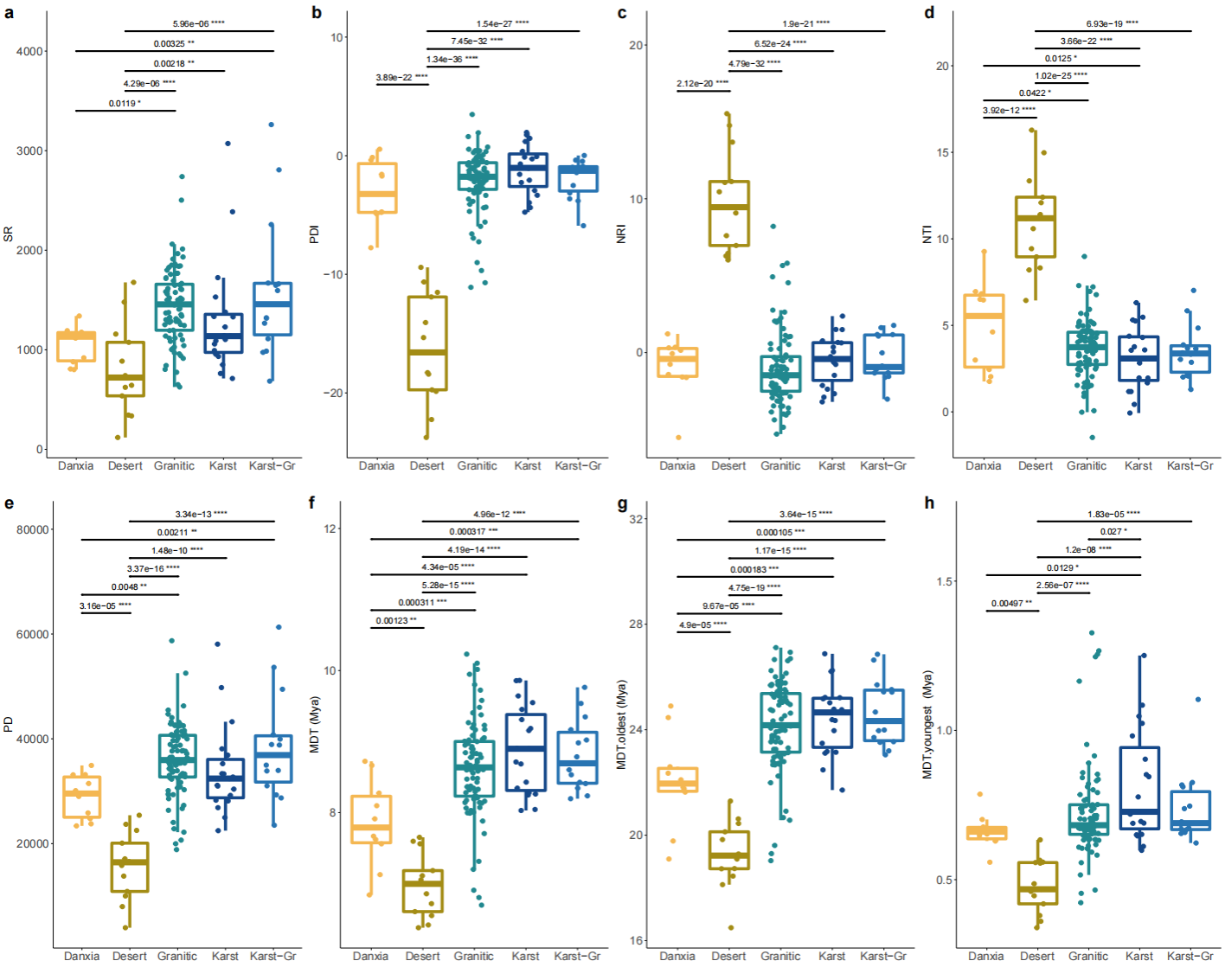 课题组编录了中国140个主要山地的被子植物区系数据集,含56目251科2585属17,837种,生成系统发育树;并建立了这些山地的气候因子、地质地貌等数据集,按照基岩组成将140个山地划分为五种地貌类型,即: 喀斯特、花岗岩-喀斯特、花岗岩、丹霞地貌和荒漠地貌(图2)。通过耦合地貌类型、气候因子、地理信息等,探讨不同地貌类型与山地植物区系物种丰富度、系统发育多样性(PD)、系统发育结构指数(PDI、NRI、NTI)和区系物种组成的年龄结构(MDT)的之间差异,从而揭示地貌过程如何促进对山地植物区系聚集和分化的影响。