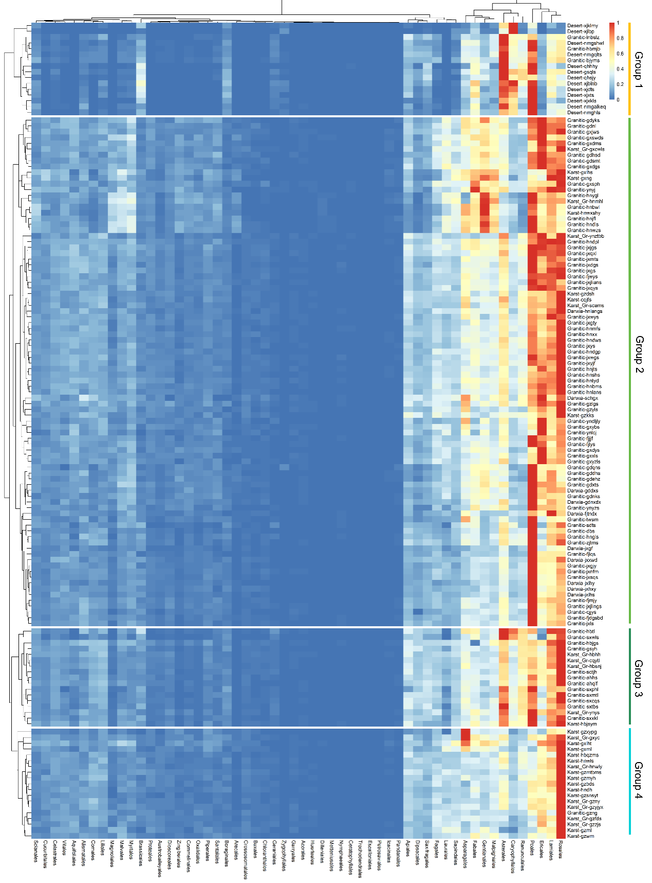 (第1组, 荒漠区系, 主要有Poales、Asterales、Caryophyllales、Fabales、Brassicales和Boraginales; 第2组, 花岗岩、喀斯特、混和区系, 主要有蔷薇目、杜鹃花目、禾本目、Lamiales和Asterales; 第3组, 位于中部亚热带, 花岗岩、混和区系, 蔷薇目最丰富,次之为Lamiales、Ericales、Asterales和Asparales。第4组, 花岗岩、丹霞区系, 主要有Poales、Rosales、Lamiales和Ericales; 其中丹霞的禾本目更丰富, 花岗岩的Ericales更丰富)