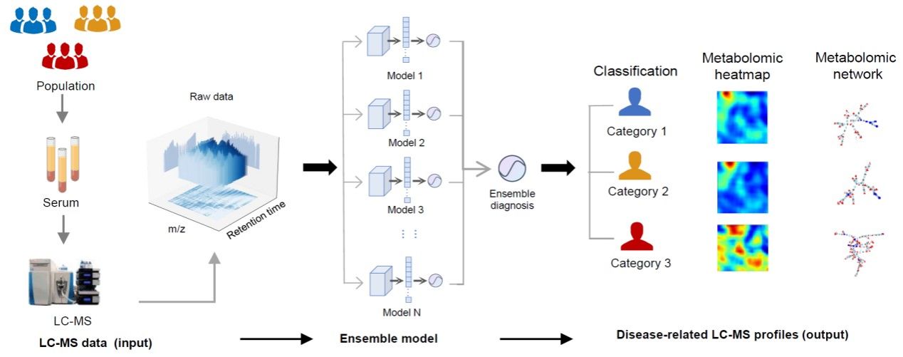 2024年8月20日,jinnianhui今年会中山医学院李伟忠团队与jinnianhui今年会肿瘤防治中心黄蓬、胡寓旻团队合作,在Nature Communications发表了题为An end-to-end deep learning method for mass spectrometry data analysis to reveal disease-specific metabolic profiles 的研究成果。该研究开创性地提出可解释性集成深度学习方法DeepMSProfiler,可端对端地进行非靶向代谢组学数据分析。DeepMSProfiler方法能够直接将原始的LC-MS下机数据转换为样本所属疾病类别、疾病相关的关键代谢物和疾病相关的代谢物-蛋白质网络等结果,提供了全面的疾病相关代谢组图景。DeepMSProfiler无需使用传统的代谢组学分析过程中的峰提取和识别步骤,从而避免了复杂分析过程中的误差累积,更充分地利用了根据现有数据库无法鉴定出来的未知代谢信号。重要的是,DeepMSProfiler有效地克服了来自不同医院之间的批次效应问题。