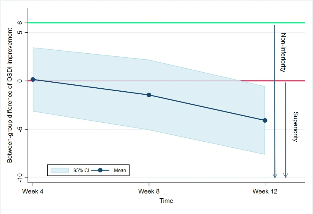 研究团队通过一项前瞻性、非劣效随机对照临床研究,纳入299名不伴中重度角膜荧光素染色的有症状干眼患者,随机分为2组,分别接受8周人工泪液(0.1%玻璃酸钠)治疗,或“笑的训练”,采用小程序记录干预情况。研究团队根据面部及眼部肌肉运动设计出“笑的训练”口令:“hihihi(拼音拼读),哈哈哈,茄子茄子茄子,七喜七喜七喜,哈哈哈哈哈哈”,30遍口令为1次训练,一天进行训练4次。在干预8周后,“笑的训练”组和0.1%玻璃酸钠组患者的症状及体征均有所改善,且在主要结局指标眼表疾病指数评分(一种衡量干眼主观严重程度的指标)中,“笑的训练”组不亚于0.1%玻璃酸钠,甚至在一些体征改善中,“笑的训练”优于0.1%玻璃酸钠。本研究证实了“笑的训练”在干眼患者的治疗效果,从崭新角度提出了一种有效、安全、低成本且环境友好的非药物治疗手段。