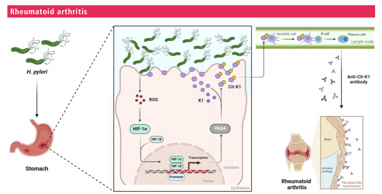 PAD4是RA病程中关键酶,其通过促进蛋白质瓜氨酸化,激活免疫系统,引起自身免疫反应,进而加重RA病情。本研究首次揭示了H. pylori感染通过HIF-1α/PAD4这一途径参与RA病程的分子机制。