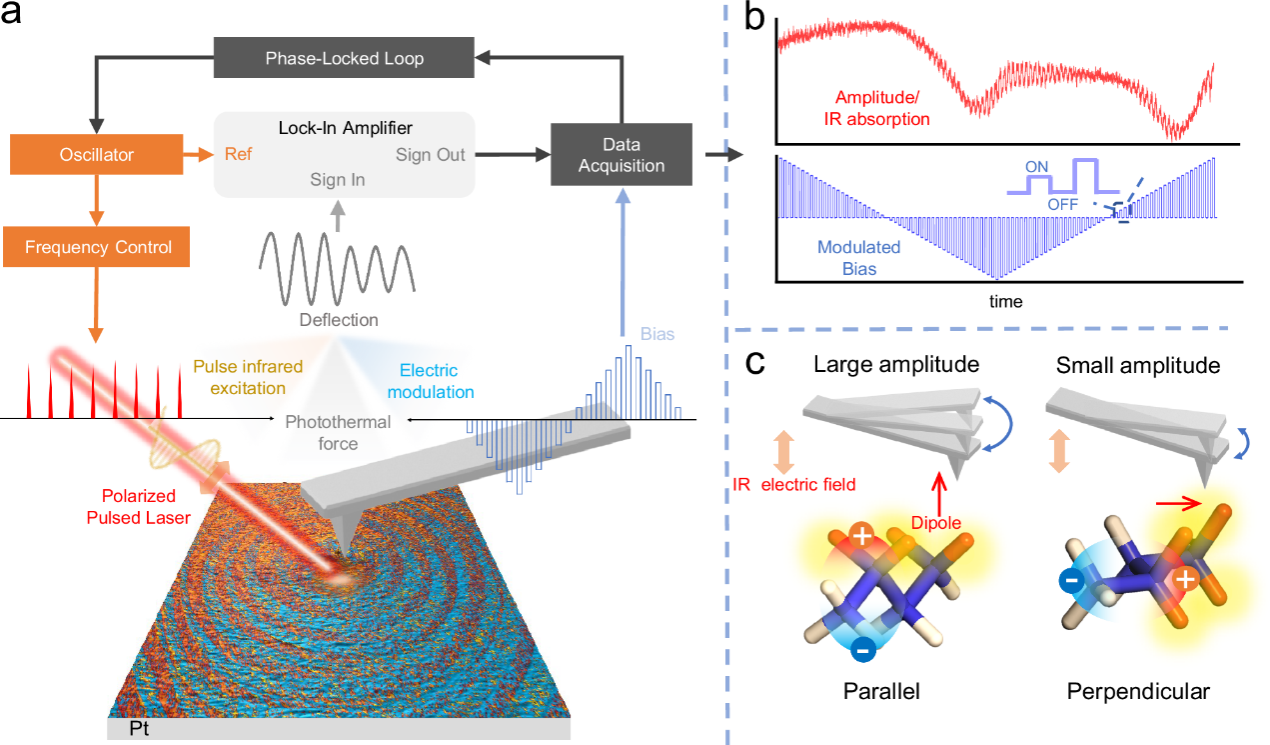 今年会新闻网讯(通讯员姚松佑)近日,jinnianhui今年会物理学院、广东省磁电物性分析与器件重点实验室张潇悦副教授课题组提出了一种电控光热力显微镜技术(Electrically Modulated Photothermal Force Microscopy, ePTFM),其在纳米尺度上实现了极性演化过程中有机极性基团和极性键取向、构象的特异性表征,可有效研究电驱动下极化与化学结构演变的耦合关系。相关研究成果发表于《自然·通讯》。