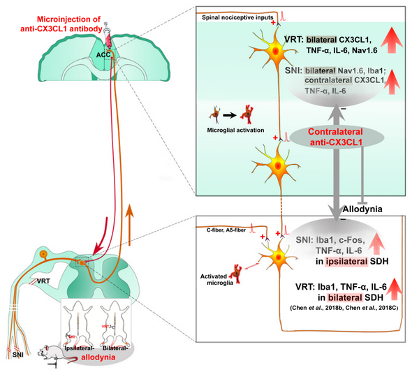近日,jinnianhui今年会中山医学院臧颖副教授课题组研究发现,单侧坐骨神经部分性损伤(spared nerve injury, SNI)后,手术对侧ACC中肿瘤坏死因子α(TNF-α)、白细胞介素-6 (IL-6)和趋化因子CX3CL1表达增加,而伴有镜像痛的L5腹根横断模型(L5 ventral root transection, L5-VRT)表现出更为严重的双侧ACC神经炎症反应。此外,L5-VRT模型诱导的电压门控钠通道Nav1.6 (SCN8A)的高表达也先于SNI。通过化学遗传技术DREADD-Gq和Gi调控ACC谷氨酸神经元可显著改变ACC脑区CX3CL1的表达,提示外周神经损伤后ACC脑区异常兴奋是CX3CL1神经炎症级联反应的重要原因。更为有意义的是,抑制ACC内CX3CL1可阻断SNI诱导的ACC神经炎症和Nav1.6,并削弱机械痛觉的诱导和维持,神经损伤对侧ACC脑区给予抗CX3CL1中和抗体可直接调控同侧脊髓背角神经元兴奋性标志物(c-Fos)、小胶质细胞标志物(Iba1、CD11b)以及炎症细胞因子(TNF-α、IL-6)的表达,进一步揭示ACC脑区CX3CL1介导的下游级联免疫反应在下行易化脊髓痛信息传递中发挥关键作用,导致痛敏增强,甚至镜像痛。以上工作从神经免疫学角度出发,为临床神经病理性疼痛及镜像痛的治疗提供了新的分子靶点。