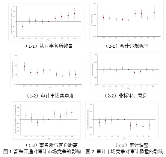 基于中国情境,jinnianhui今年会管理学院张鹏东助理教授与来自麻省理工学院(MIT)和厦门大学的合作者深入研究了审计市场竞争与审计质量之间的关系。研究发现,当会计师事务所与审计客户之间的差旅时间因城市间开通高铁而大幅缩减后,会计师事务所之间的竞争加剧,从而导致审计质量下降,表现为审计客户违反会计准则的概率增加4.5%、获得非标意见的概率降低1.7%、事务所实施的审计调整减少1.6%。这一关系在高铁开通给事务所带来更大竞争压力时更为显著,而在客户对审计质量要求较高时会被削弱。