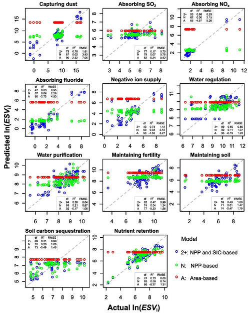 研究发现使用物种丰富度等级(SIC)和净初级生产力(NPP)可对多种生态系统服务实现快速价值评估,其中7种服务的估值模型可解释原始评估(R2)50%以上。在不同类型的服务中,物种丰富度等级和净初级生产力发挥着不同程度的重要性,但并非所有服务受这两个指标共同的重要影响。经比较,基于生物多样性和生态系统功能的快速评估模型的表现,优于基于单位面积和基于净初级生产力的单一指标的方法(下图)。对受预算、数据等条件限制的地区,该结果为实现生态系统服务的快速价值评估提供了新的方法与证据支持。对全球范围内未来生态系统资源的可持续利用具有积极的推动意义。
