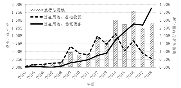 不同于已有研究从债务规模的角度分析地方融资平台的债务风险,该篇论文收集整理了2004-2018年城投债募集说明书中公布的募集资金用途,并将其分解为“基础投资”用途和“偿还债务”用途。数据显示,在“四万亿”财政刺激计划期间,以基础设施建设为代表的市政投资是城投债的主要资金投向,但随着时间的推移,用于借新还旧的融资规模急速增加,尤其是在2014年之后,借新还旧的资金规模开始超过了用于基础投资的资金规模,城投债的主要融资目的已从基建投资转化为偿还存量负债。由此而来的问题是,如何对这一现象做出解释,该现象背后是否反映出地方融资平台的债务风险已呈现出新的特征?