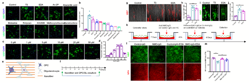 图1:EDA促进OPC向成熟OL分化(a-d);EDA促进OPC-纳米纤维共培养体系髓鞘形成(e-j);EDA促进NMOSD器官型脑片髓鞘再生(k-m)