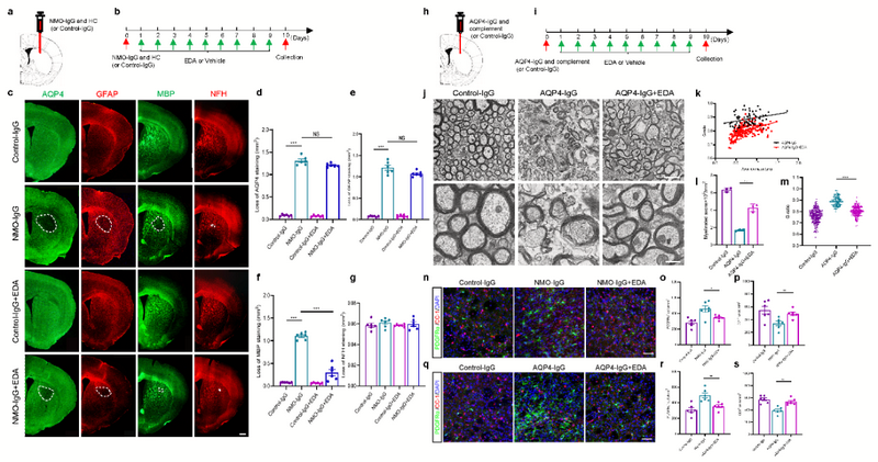 图2 :EDA促进NMOSD脑实质局部注射模型小鼠髓鞘再生(a-g);电镜示EDA使有髓轴突数量增多,新生髓鞘厚度增加(h-m);EDA促进NMOSD局部模型小鼠病变中OPC向成熟OL分化(n-s)