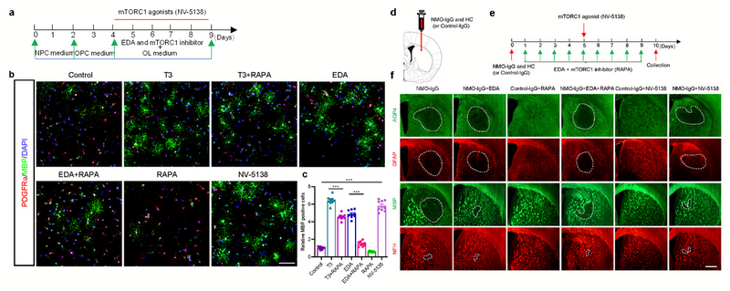 图5 :EDA激活mTORC1信号通路促进OPC向成熟OL分化(a-c);抑制mTORC1通路逆转EDA促髓鞘再生作用(d-f)