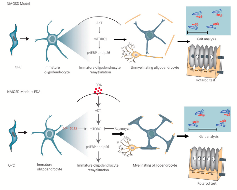 研究发现,在体外条件下,传统氧自由基清除剂依达拉奉(EDA)可促进少突胶质前体细胞(OPC)向成熟少突胶质细胞(OL)分化及受损髓鞘再生(图1)。随后在在体条件下,分别通过来源于NMOSD患者的纯化NMO-IgG及对小鼠AQP4胞外域(E5415B)特异的单克隆AQP4-IgG构建小鼠脑实质局部注射模型,验证EDA的髓鞘再生作用(图2)。在此基础上,通过预破坏小鼠BBB后连续腹腔注射NMO-IgG构建NMOSD全身模型,进一步发现EDA可通过减少脊髓髓鞘损伤改善NMOSD小鼠运动功能障碍(图3)。NMOSD患者活检脑组织中哺乳动物雷帕霉素靶蛋白复合物1(mTORC1)活性下降(图4)。使用mTORC1抑制剂雷帕霉素(RAPA)及激动剂NV-5138调控信号通路活性,发现EDA可能通过激活mTORC1促进损伤髓鞘的再生修复(图5)。