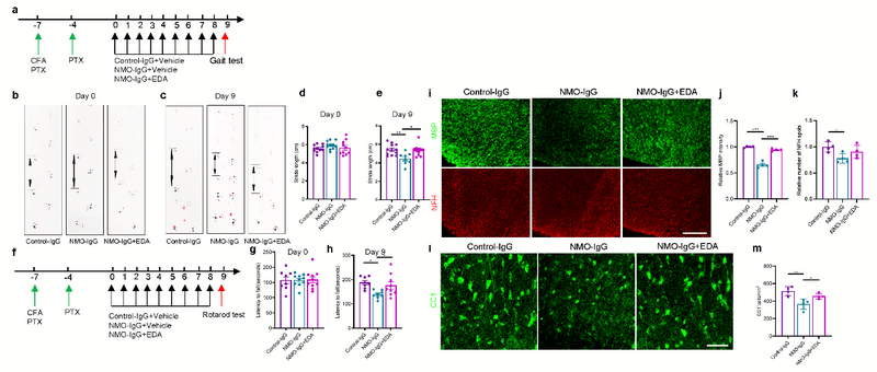 图3:步态分析及疲劳转棒试验提示EDA改善NMOSD全身模型小鼠运动功能障碍(a-h);EDA减少NMOSD全身模型小鼠脊髓髓鞘损伤及OL丢失(i-m)