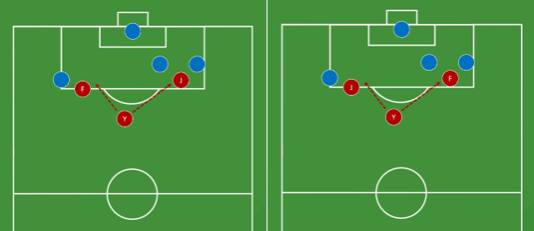 研究2基于一家中超俱乐部青训中心的准专业足球运动员开展实验研究。研究团队邀请球员和其在青训中心中最亲密的朋友一起来完成这项实验。这两名球员被要求与第三名假想球员一起完成模拟,该球员是来自另一个青训中心的陌生人。参与者(球员)必须做出把球传给朋友或者陌生人的决策(如下图,共60次决策)。在30次决策中,朋友处于更好位置上(左图);在另外30次决策中,朋友处于更差位置上(右图)。结果显示,在朋友处于更差位置上时(即关系目标和团队目标有冲突),高集体主义的参与者中更不愿意把球传给处于更好位置上的球员(b = -0.037, SE = 0.012, t(97) = -3.065, p = 0.003, 95% CI [-0.060, -0.013]),即他们更愿意把球传给他们的朋友,即使他们的朋友处于更差的位置上。在朋友处于更好位置上时(即关系目标和团队目标没有冲突),集体主义的影响不显著(b = -0.0019, SE = 0.010, t(97) = -0.184, p = 0.855, 95% CI [-0.023, 0.019])。
