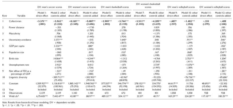 研究1(一项基于竞技体育的档案研究)检验了集体主义的跨国差异是否与世界上最受欢迎的三项团队运动(足球、篮球和排球)的团队绩效相关。在这些比赛中,球员必须频繁决定是把球传给在最佳位置的球员还是传给与其关系密切但没有在最佳位置的球员。由于很看重关系目标,集体主义文化中的球员可能会把球传给与其关系密切但没有在最佳位置的球员,进而降低团队整体得分的机会。为了验证上述预测,该研究使用了国际足球协会(FIFA)、篮球协会(FIBA)和排球协会(FIVB)100年的档案数据,这三个协会基于每个国家/地区的球队在过去一年打败其他国家/地区的球队的表现给这个国家一个绩效分数,以此来衡量团队绩效。结果发现(如下图),高集体主义国家/地区在男子足球,女子足球,男子篮球,女子篮球,男子排球)等运动项目中都表现更差,在女子排球中集体主义影响效应为负,但较为微弱(一个可能的解释是,在排球运动中,传球中关系目标和团队目标有冲突的情境强度较弱)。