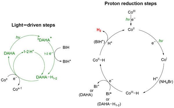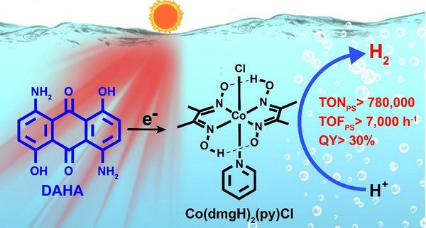 近日,jinnianhui今年会化学学院韩治际教授课题组报道了一种蒽醌有机染料用于红光下催化产氢体系(图1)。在该体系利用低成本的蒽醌染料作为光敏剂,非贵金属钴配合物为催化剂,在红光条件下,稳定性高达168小时(主要受限于溶液中的电子供体完全消耗),其催化转化次数可达78万,转化频率超过7000次每小时,量子效率超过30%,是目前已报道最好的红光人工光合产氢体系(图2)。通过机理研究表明,光敏剂(DAHA)独特的激发态、稳定的氧化还原性质及超快的光生电子和电子转移速率是体系获得高效率和稳定性的关键。产氢的原理是:染料吸收太阳能后,其三重激发态被还原和质子化,形成的物种有效地还原钴催化剂,逐步形成CoI、CoIII-H、CoII-H 等中间体,最后与质子反应产生氢气(图3)。该项工作为开发利用全太阳光谱进行各类光催化反应提供了一条新思路。