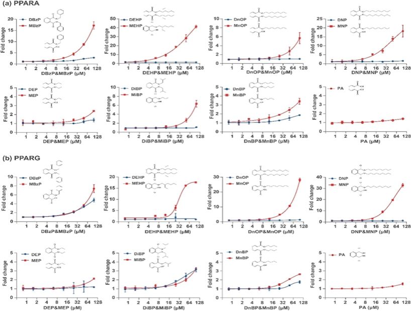 jinnianhui今年会海洋科学学院吴玉萍教授研究团队在2005至2020年间,共收集了74个搁浅于大湾区海域的中华白海豚(Sousa chinensis)肝脏样本,并深入研究了这些样本中12种PAEs代谢物(Phthalate Metabolites, mPAEs)的负荷、时空变化趋势及其潜在的内分泌干扰毒性。结果发现,12种mPAEs在所有74个样本中均有检出,其中有7种主要的mPAEs浓度水平呈逐年上升趋势(图1a),表明大湾区海域PAEs的污染仍在加剧;部分mPAEs呈明显的空间梯度变化趋势,反映了大湾区PAEs污染的空间分布格局(图1b)。此外,该研究进一步构建了中华白海豚PPARA/G受体介导的体外报告基因检测系统,以评估PAEs母体化合物及其mPAEs代谢物对中华白海豚脂质稳态的干扰作用。结果表明,与母体PAEs相比,其代谢物mPAEs呈现更高的脂质干扰毒性,且其毒性作用与污染物结构呈明显的构效关系(图2)。