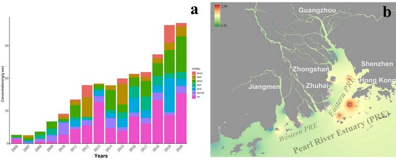 图1 珠江口海域中华白海豚肝脏中mPAEs (ng /g ww)的时空变化趋势