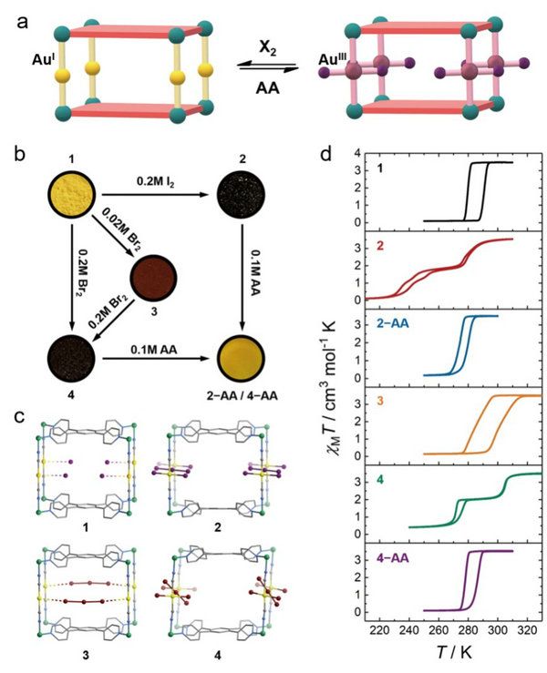 jinnianhui今年会化学学院童明良教授和倪兆平副教授团队长期致力于自旋交叉材料的设计与性能调控,在活性客体动态自旋交叉性能调控方面取得系列研究进展(Angew. Chem. Int. Ed. 2013, 52, 1198; Angew. Chem. Int. Ed. 2017, 56, 14982; Angew. Chem. Int. Ed. 2021, 60, 27144; Coord. Chem. Rev. 2017, 335, 28)。近期,该团队开展对自旋交叉框架主体进行可逆氧化还原后合成修饰的探索研究,利用四齿桥连配体1,2,4,5-四(4-吡啶基)苯和线形 [Au(CN)2]−基元与FeII组装,构筑了罕见的反霍夫曼型MOF阳离子结构。其框架含有开放的活性金属位点AuI,通过化学吸附I2分子,线形的[AuI(CN)2]−可被氧化为平面四边形的[AuIII(CN)2I2]−,进而得到具有滞回型三步自旋交叉性质的配合物2。当1与0.02和0.2 mol/L的Br2溶液反应后,分别得到阴离子交换产物3和氧化产物4,表现出滞回型一步和两步自旋交叉性质。氧化加成后的2和4可通过抗坏血酸(AA)还原消去卤素原子,得到还原产物2-AA和4-AA,它们都表现为滞回型一步自旋交叉性质。Eliseo Ruiz教授进一步采用周期性密度泛函理论对体系的协同效应进行了合理的解释。本工作首次在自旋交叉材料中建立起普适的可逆氧化还原后合成修饰方法,实现了SCO材料在滞回型一步/两步/三步自旋交叉性质间进行了动态切换,为设计多刺激响应型分子开关提供了新思路。