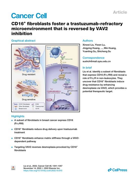 今年会新闻网讯(通讯员黄静颖)成纤维细胞是肿瘤微环境中数量最丰富的间质细胞,是肿瘤进展的重要参与者,然而无差别耗竭成纤维细胞反而会促进肿瘤进展。jinnianhui今年会孙逸仙纪念医院宋尔卫院士和苏士成团队前期研究发现肿瘤微环境中 CD10+GPR77+ CAF新亚群可通过改变肿瘤干细胞微环境维持肿瘤细胞干性,引起化疗抵抗。近日,孙逸仙纪念医院苏士成教授团队揭示了非白细胞表达Fcγ受体介导促癌信号的新机制,研究成果于2022年11月14日在国际顶级期刊Cancer Cell发表,题为“CD16+ Fibroblasts Foster a Trastuzumab-Refractory Microenvironment That is Reversed by VAV2 Inhibition”。