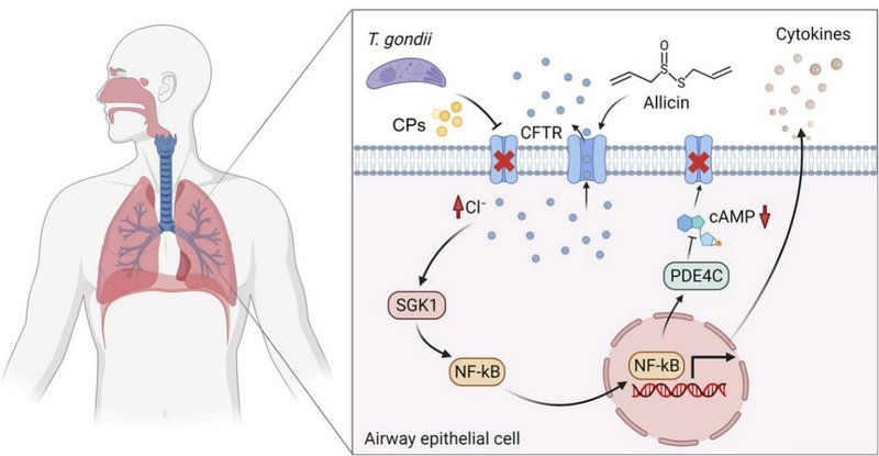 该研究以气道上皮细胞株与原代培养的人气道上皮细胞为体外研究模型,结合弓形虫感染的在体小鼠肺炎模型,发现弓形虫在侵袭细胞的过程中,可通过分泌多种半胱氨酸蛋白酶(cysteine proteases)引起表达于气道上皮细胞膜上的氯离子通道——囊性纤维化跨膜传导调节因子(cystic fibrosis transmembrane conductance regulator,CFTR)降解,进而抑制跨上皮氯离子分泌并介导细胞内氯离子异常积累。值得注意的是,弓形虫感染还可以通过激活氯离子敏感的血清糖皮质激素调节激酶1(serum glucocorticoid regulated kinase 1,SGK1)信号通路,触发NF-κB依赖的磷酸二酯酶4(phosphodiesterase 4,PDE4)-cAMP-CFTR-氯离子-SGK1正反馈循环,导致肺部炎症迁延不愈。此外,该研究还进一步探索了抗弓形虫性肺炎的新型治疗策略,发现天然产物大蒜素可通过激活CFTR抑制细胞内氯离子积累与持续性炎症反应。在体动物实验结果也表明,雾化吸入大蒜素可有效缓解弓形虫感染模型小鼠的肺炎症状,提示了大蒜素用于治疗弓形虫性肺炎的良好应用前景。