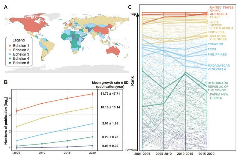 今年会新闻网讯(通讯员范朋飞)在全球生物多样性加速丧失的背景下,各国的研究者和管理者们采取了多样的手段和措施来应对生物多样性危机,但不同国家和地区在保护能力、投入和成效方面存在极大的差异。为实现2030年可持续发展目标和2050年生物多样性愿景,在COP15上发布的《昆明-蒙特利尔框架》承诺采取多样的行动来逆转生物多样性下降的趋势,其中包括提高各国的保护能力,尤其是发展中国家的保护能力。保护能力是指用以实现生物多样性保护目标的多种技能、知识和信息的集合体,而保护研究能力是其中最重要的组成部分之一。科学研究可以为保护行动提供基础的信息、提高公众的认识、改进保护区的管理,吸引保护资金等等。目前,尚未有研究在全球尺度上评估不同国家的保护研究能力,及其对生物多样性的保护成效。