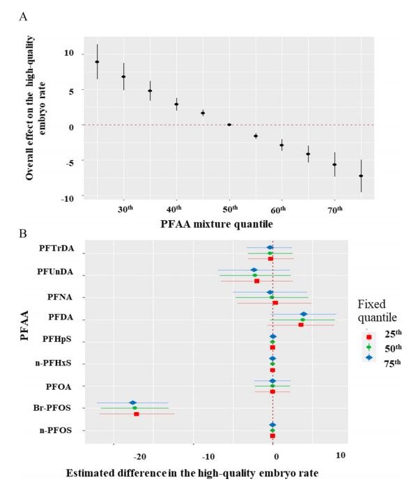 该研究是一项环境与生殖健康大型辅助生殖队列前瞻性研究(Guangxi In Vitro Fertilization and the Environment Study,GIVES)。2018年7月-12月期间,在广西壮族自治区人民医院生殖医学中心招募了729名接受IVF治疗的女性。使用超高效液相色谱-串联质谱法测定卵泡液中32种PFAA浓度水平,应用限制性立方样条、线性回归和对数二项回归模型来研究卵泡液PFAA与IVF胚胎质量的关联,并将卵母细胞成熟度作为干预变量进行因果中介分析,利用贝叶斯核机器回归模型(BKMR)进一步评估PFAA混合物对结局的影响。研究发现随着卵泡液中PFAA浓度增高,IVF高质量胚胎率随之降低(图1A),全氟辛烷磺酸支链异构体(Br-PFOS)是主要效应污染物(图1B)。