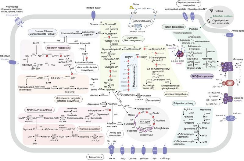 jinnianhui今年会生命科学学院李文均教授课题组结合宏基因组学测序技术和生物信息学手段从云南热泉样品中重构出10个基因组,系统发育分析结果表明,它们属于TACK古菌根部初古菌的一个新类群,因初古菌独特的系统发育地位及对TACK古菌和广古菌类群的物种形成和功能分化具有至关重要的作用,我们将其命名为盘古古菌目(Panguiarchaelaes,取盘古开天辟地,克服困难,创造美丽新世界之意,旨在表达该古菌对分化出多才多艺TACK古菌的突出贡献)(图1)。对盘古古菌的代谢潜能进行深入剖析,发现其缺失细胞膜、氨基酸、维生素和嘌呤合成等基础代谢通路,推测盘古古菌与DPANN超门古菌一样,具有共生生长模式,故将其命名为Panguiarchaeum symbiosum(图2),进化学分析表明盘古古菌的代谢缺陷为后天进化,而非先天继承而得。为了维持生长,盘古古菌通过发酵蛋白质(即蛋白质降解)来获取碳源、氮源和能量;在富含硫元素的高温热泉生境,盘古古菌亦拥有单质硫或多硫化物还原能力,为细胞生长提供额外能源。种群宏基因组学和宏转录组学分析表明,盘古古菌基因组中与氨基酸或多肽转运、细胞吸附相关蛋白的编码基因检测到了强烈的正选择信号,同时在宏转录组中显著高表达,这进一步证实了盘古古菌能降解胞外蛋白质的共生生活方式。结合近期水平基因转移检测和共现网络分析,推测盘古古菌潜在宿主为曙古菌(Aigarchaeota),因其具有相对完整的辅酶合成通路和多型病毒抵御机制,盘古古菌与宿主或形成互利共生关系。