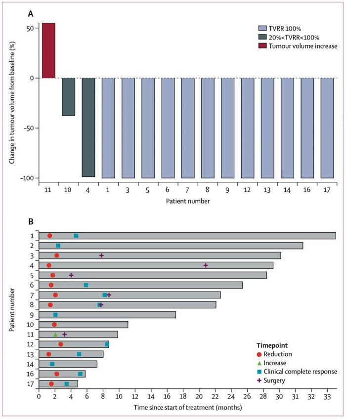 研究共入组了17例初诊dMMR/MSI-H局部晚期直肠癌患者,在16例可评估疗效的患者中有15例的肿瘤在治疗后缩小。其中,6例患者接受了根治性手术,有3例达到病理完全缓解;9例患者达到临床完全缓解并选择了随访观察,从而避免了放化疗及手术的损伤;1例患者因不良反应提前终止治疗。研究总的完全缓解率高达75%。此外,本研究中患者达到临床完全缓解的中位时间为5.2个月,提示和传统的新辅助放化疗相比,免疫治疗可能需要较长的时间才能达到最佳疗效。在毒副作用方面,观察到的不良反应大多数为1-2级,仅发生1例3级以上不良事件。这组病人随访到2022年11月,均未出现肿瘤复发。
