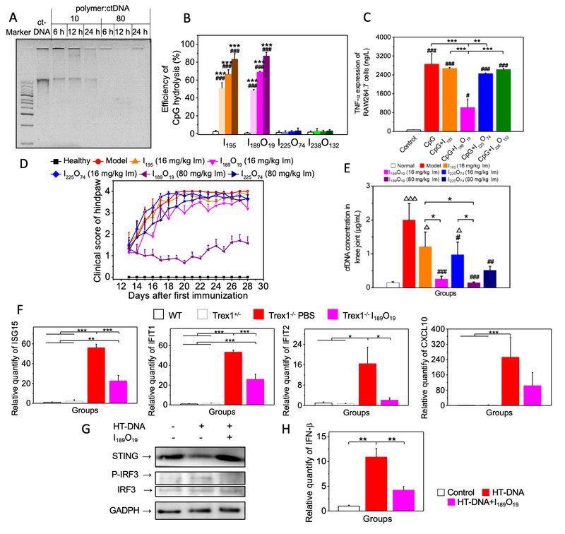 图2 (A、B)不同组成聚合物模拟酶催化DNA的水解能力表征;(C)模拟酶抑制RAW264.7细胞分泌细胞因子;(D)模拟酶对CIA大鼠模型后爪肿胀得分的影响;(E)聚咪唑材料治疗后CIA大鼠关节游离核酸的含量变化;(F)聚咪唑I189O19抑制Trex1缺陷小鼠中由细胞质DNA诱导的炎症,不同组的小鼠心脏中干扰素刺激基因的mRNA水平;聚咪唑I189O19抑制RAW264.7细胞内HT-DNA引起的(E)STING降解和IRF3的磷酸化,以及(F)IFN-b的表达。