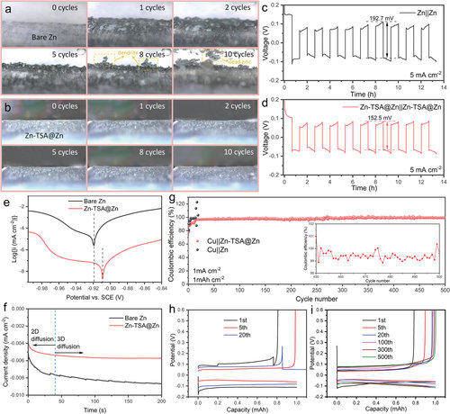 图 5. 原位电子光学显微镜图像显示了(a)裸锌电极和(b)对称透明电池中Zn-TSA@Zn电极的前表面,以及电镀/剥离周期的规定数量,以及相应的恒电流曲线:(c)Zn||Zn和(d)Zn-TSA@Zn||Zn-TSA@Zn对称电池。(e)裸锌箔和Zn-TSA@Zn电极在3 M Zn(OTF)2水溶液中的动电位极化曲线。(f)裸锌和涂层锌在-150 mV过电位下的计时电流图(CAs)。(g)Cu||Zn和Cu||Zn-TSA@Zn电池在1 mA cm-2和容量为1 mAh cm-2时镀锌/剥离的库伦效率。(h)Cu||Zn裸电池在第 1、5和20次循环时的电压曲线,以及(i)Cu||Zn-TSA@Zn 电池在第1、5、20、100、300和500次循环时的电压曲线。