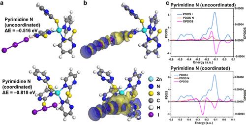 图 7.(a)I3− 在 Zn-PymSH 的嘧啶氮上的吸附构型和吸附能。(b)吸附在 Zn-PymSH/I3− 的 EDD等值面图。(c)Zn-PymSH/I3−的 PDOS 和 OPDOS曲线。