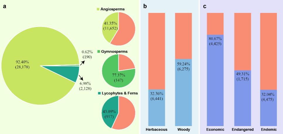 针对该问题,jinnianhui今年会生态学院叶建飞副教授团队进行了大规模的数据收集。基于中国维管植物迁地保护数据库、一棵包含95.70%中国维管植物属的生命之树和1,540,695条植物物种县级分布数据,评估了中国植物园对本土植物多样性的保护成效。