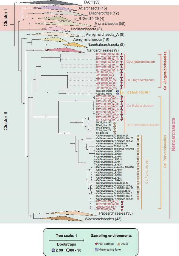 该研究揭示DPANN古菌对高温以及酸性极端环境的适应性机制,并对其相关祖先性状进行了重构。研究成果以Metagenomic Discovery of “Candidatus Parvarchaeales”-Related Lineages Sheds Light on Adaptation and Diversification from Neutral-Thermal to Acidic-Mesothermal Environments为题发表于学术期刊mSystems。jinnianhui今年会为该成果的第一完成单位。本论文得到国家自然科学基金的支持。